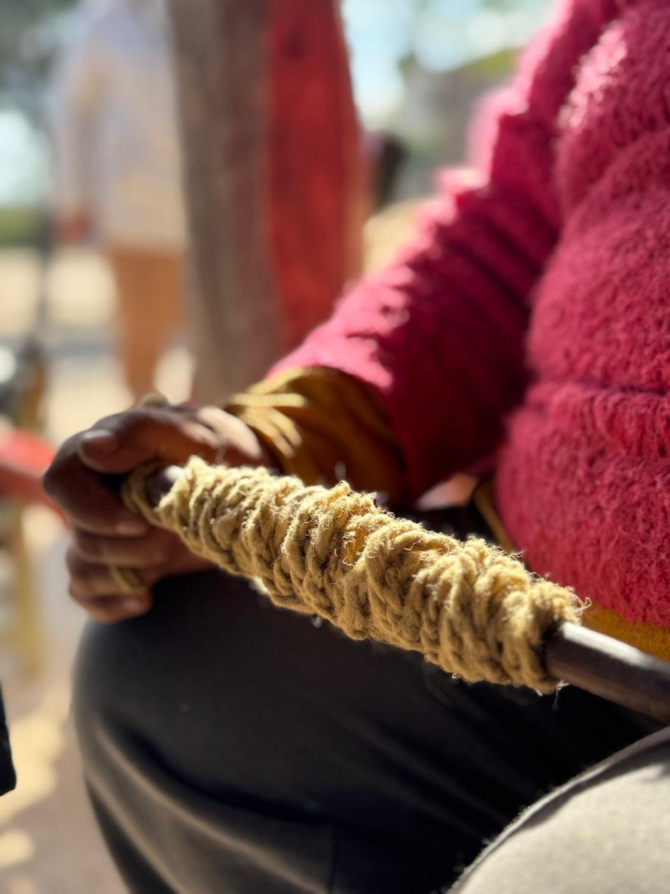 Their craft begins long before the loom. It starts with the sheep, sheared by hand, their wool carefully spun using husosand ruecas into soft, strong thread. Each skein is then washed, twisted, and dyed using ingredients drawn directly from the monte: the grey tones of the Jume root, the golden hues of hollín, the warm terracotta of algorrobo resin mixed with orange dye. The colours of these pieces are never artificial—they’re rooted, organic, seasonal. Subtle shifts in tone reflect changes in harvest, weather, and soil. Every shade carries a story.